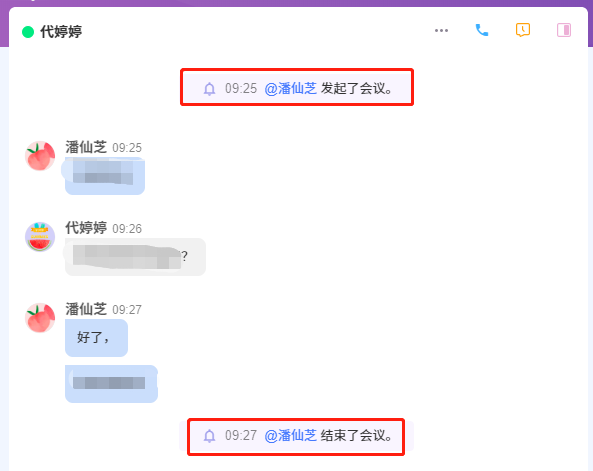 结束音视频会议后,在聊天窗口页面会记录和显示音视频会议开始和结束的时间。