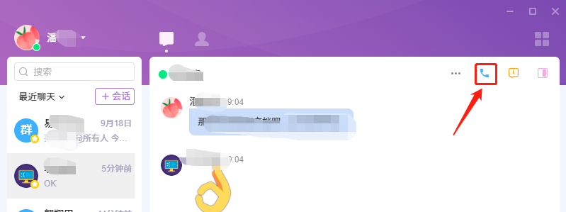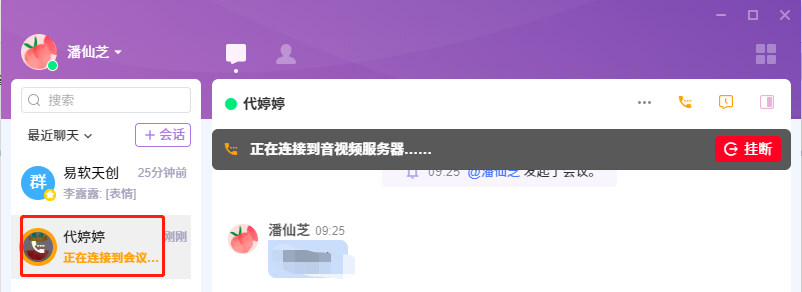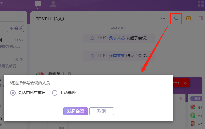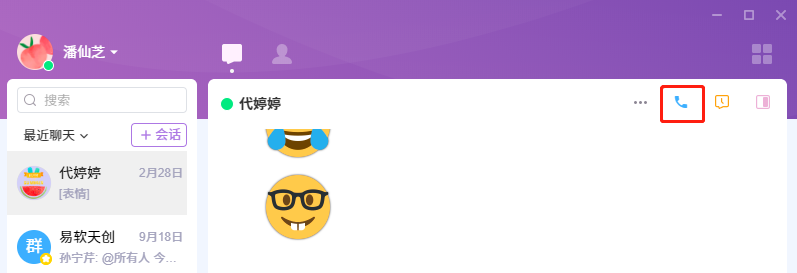 点击会话窗口的右上角中,下图红框内的“发起会议”按钮,即可开启音视频会话。