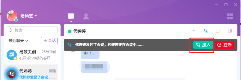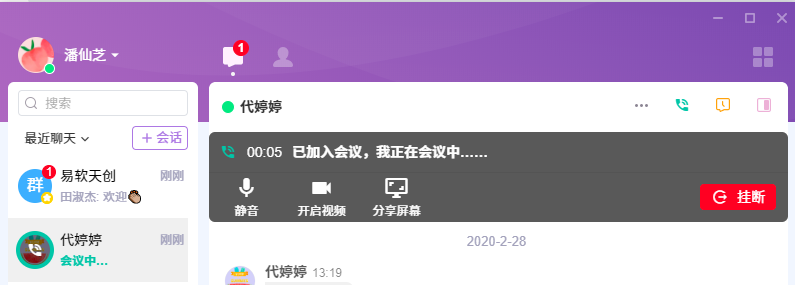 左侧会话列表正在进行音视频会议的成员,下面的状态会显示为“会议中…”。