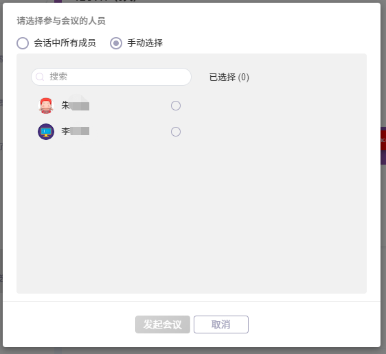 手动选择参会人员,然后点击“发起会议”即可。