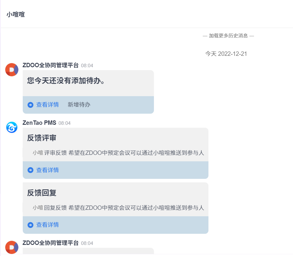 升级后原消息通知将会放在机器人会话中,默认会包含我们内置的通知信息,后续您可以配置应用选择将希望收到的实时信息放在机器人中。例如,若您配置禅道作为后台,禅道的相关通知会出现在机器人会话中。