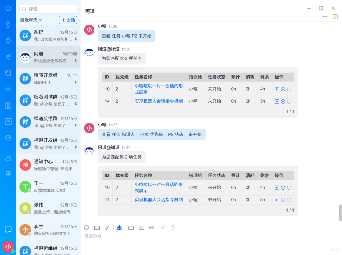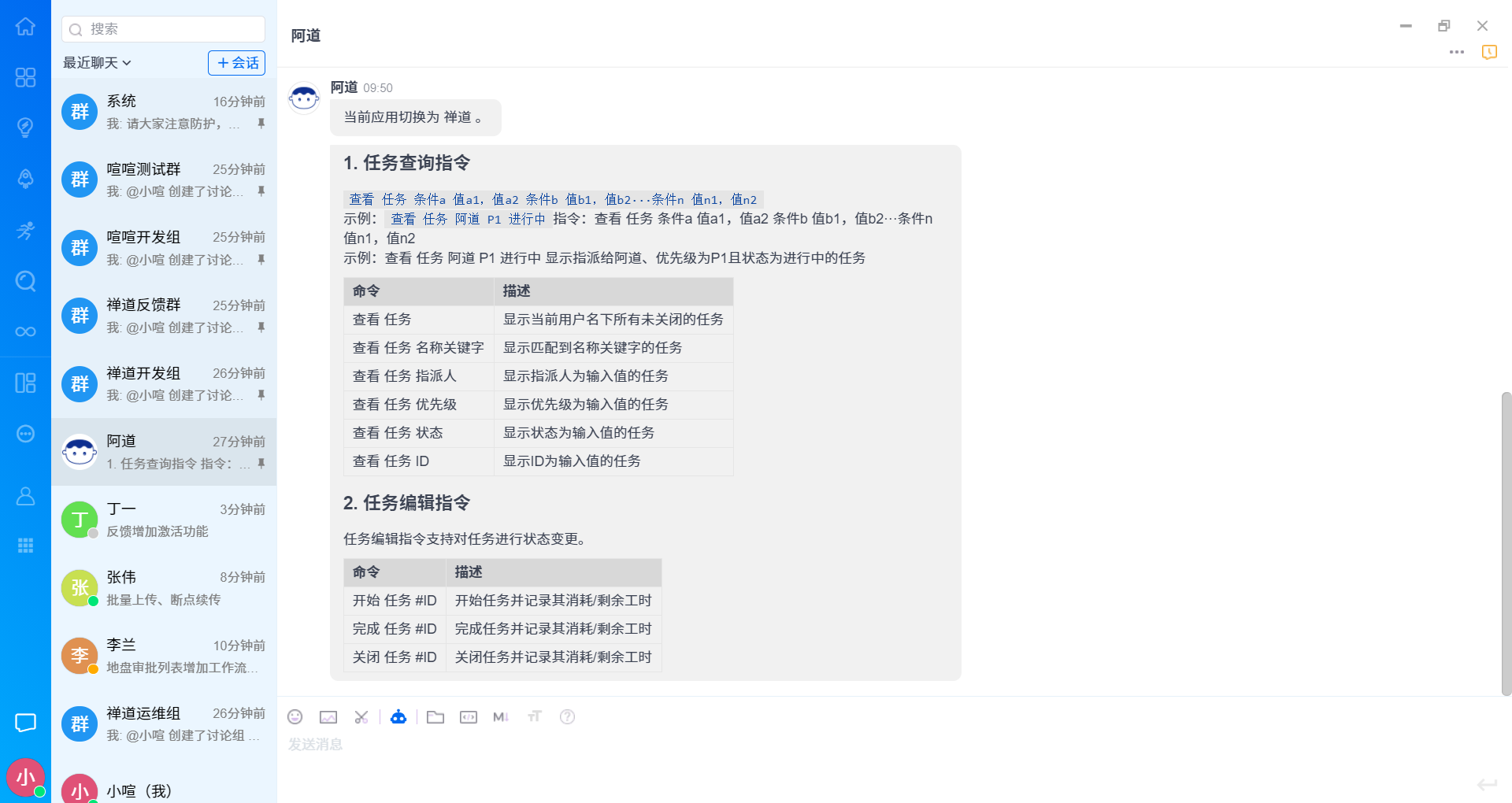 首先需要输入“禅道”进入应用下,指令支持对禅道中任务进行查询及操作。