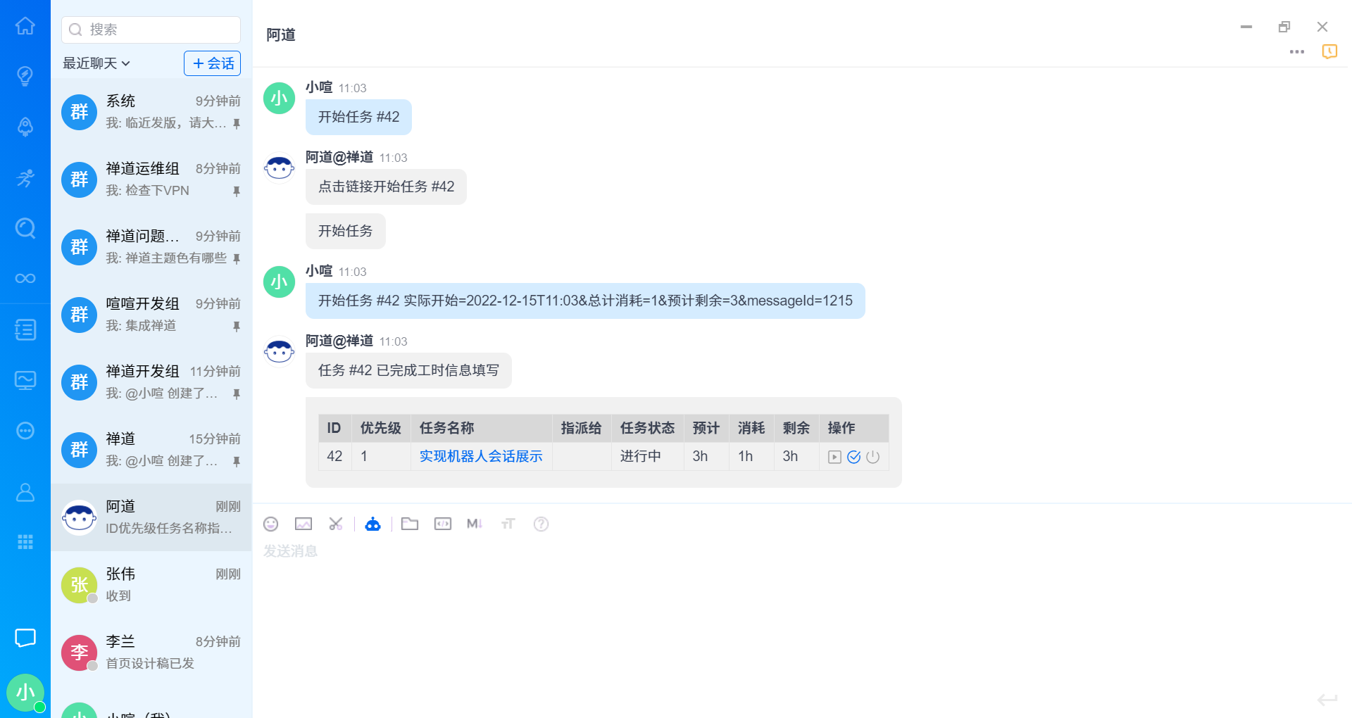 若您使用禅道作为后台配置,我们支持通过指令对禅道任务相关控制,实现开展高效办公。