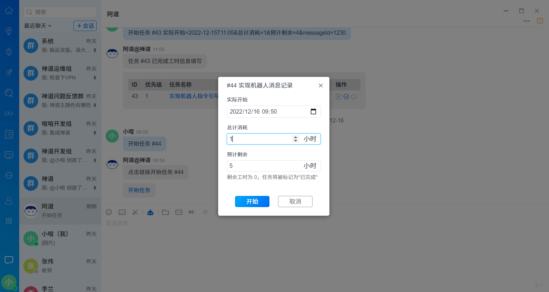 您也可以通过输入操作指令格式实现任务操作,指令格式为:操作动作(开始、完成、关闭) 任务 #ID。