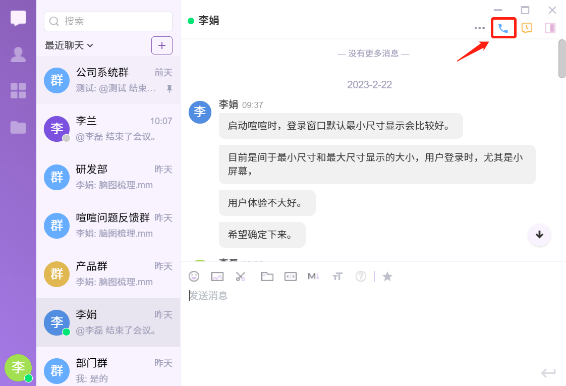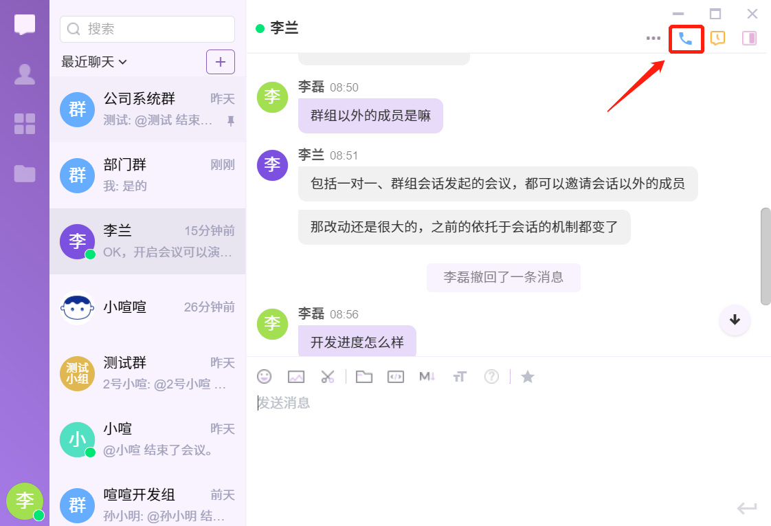 打开一对一会话界面,点击会话窗口的右上角中,下图红框内的“发起会议”按钮,即可开启音视频会话。