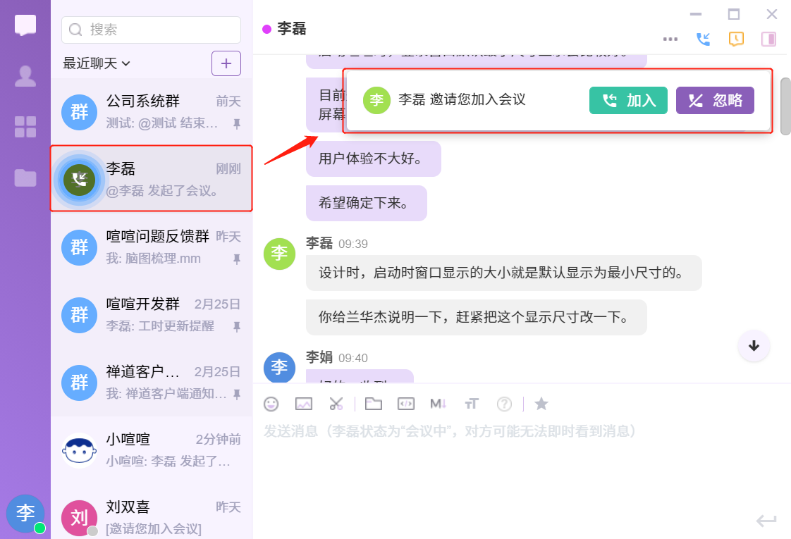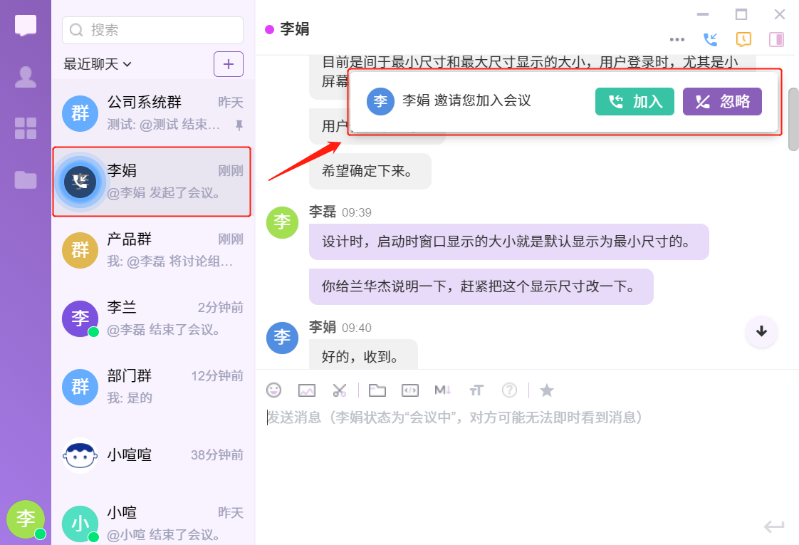 - 收到邀请的用户将会在消息列表提醒,头像以水波效果动态显示,标识一条未读信息,显示会议相关性信息。