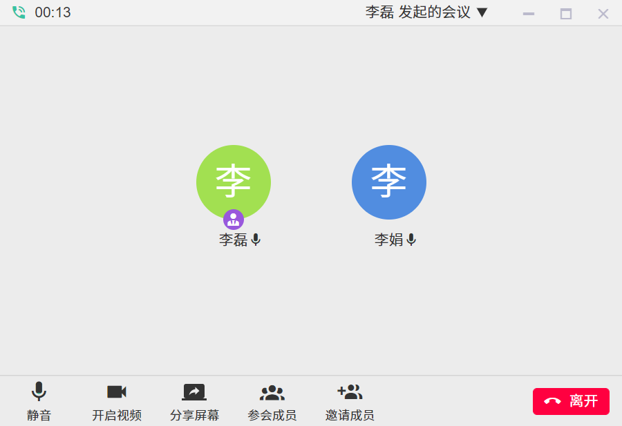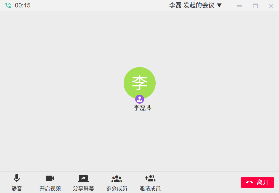 发起会议的用户将会直接进入到会议界面,状态自动转变为“会议中”,会议界面显示用户头像、名称,默认开启音视频设备。