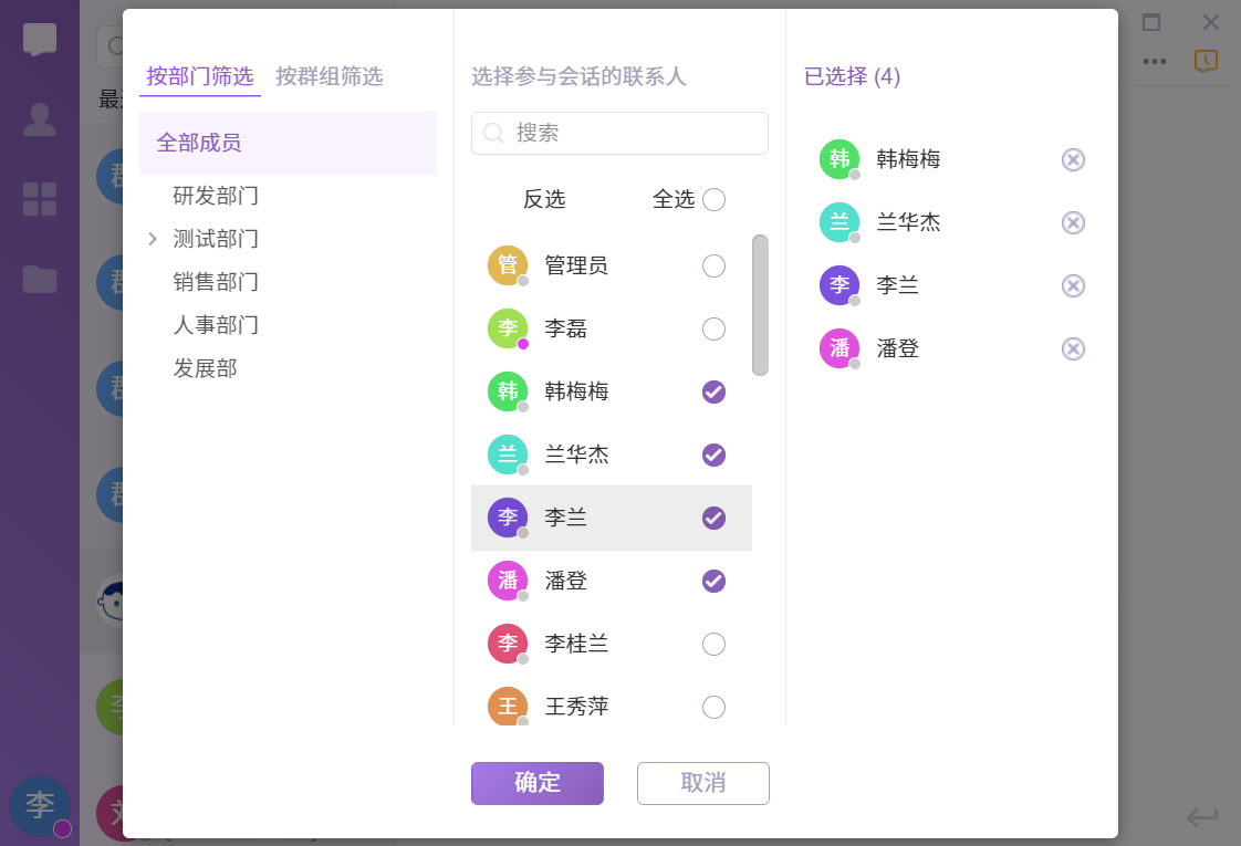 点击“邀请成员”按钮后,弹出筛选成员界面,默认显示筛选到全体成员,支持用户按照部门或讨论组进行筛选,可以按照部门及成员名搜索过滤。支持批量选择邀请的成员,点击确认后将会发送出邀请信息。