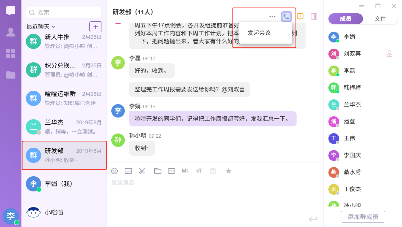 2、提供独立的会议发起入口,支持按照部门、讨论组筛选参会成员,一键快速发起企业级会议。