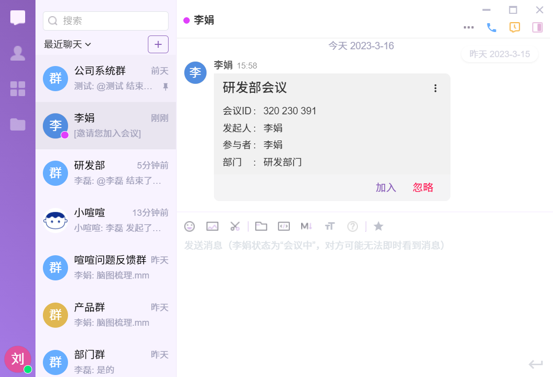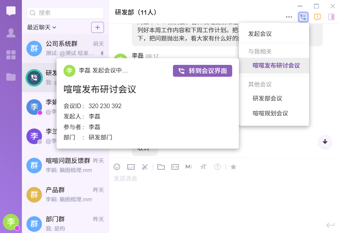 为了不打乱您最近聊天列表的顺序,我们采用小喧喧机器人进行会议邀请,受邀用户都将在小喧喧会话中收到会议邀请,邀请信息包含:会议主题、发起人、会议时间、参会人及参会部门。
