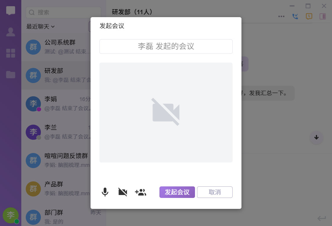 - 会议发起人点击右下角的“离开”、“结束”均为结束操作,会议结束后界面自动消失,在一对一聊天窗口页面会记录和显示音视频会议开始和结束的时间。