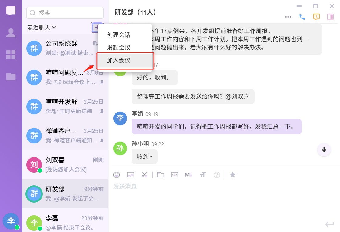 4、音视频会议支持通过ID加入,同时可以快速将会议分享至会话,提供您更灵活的操作方式。