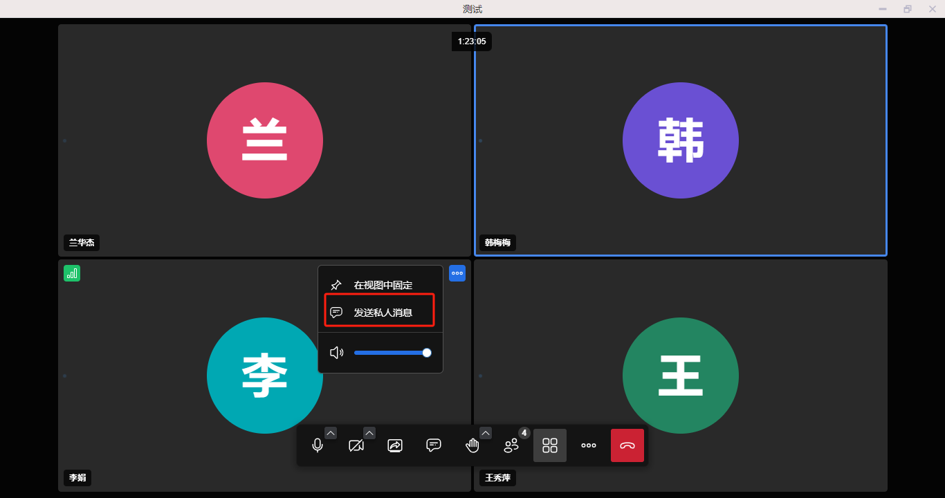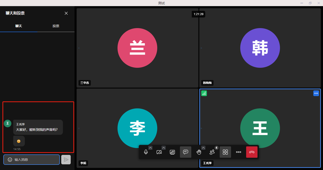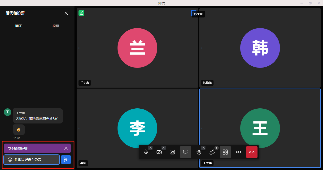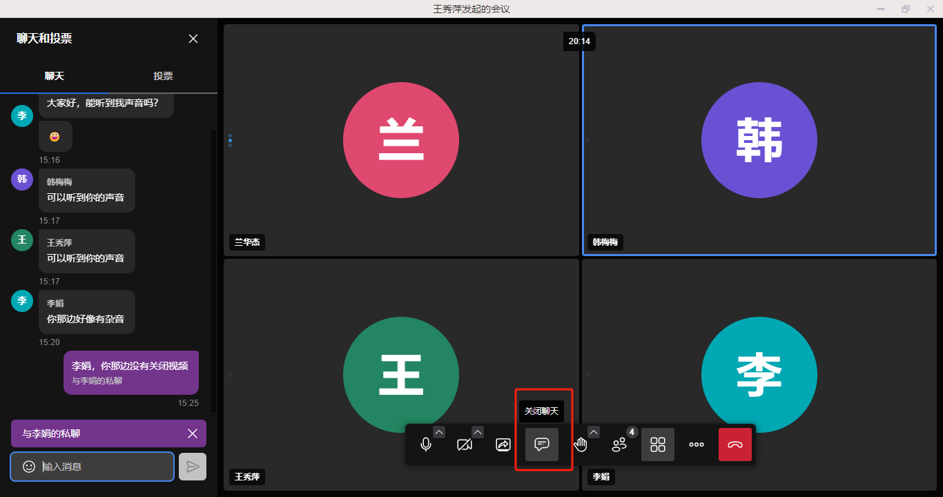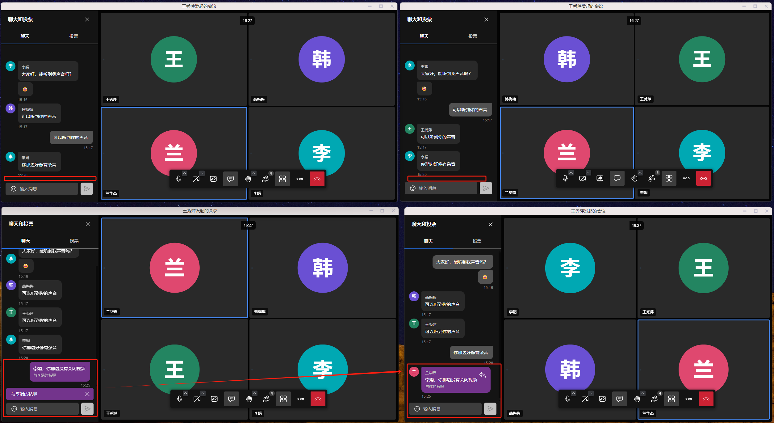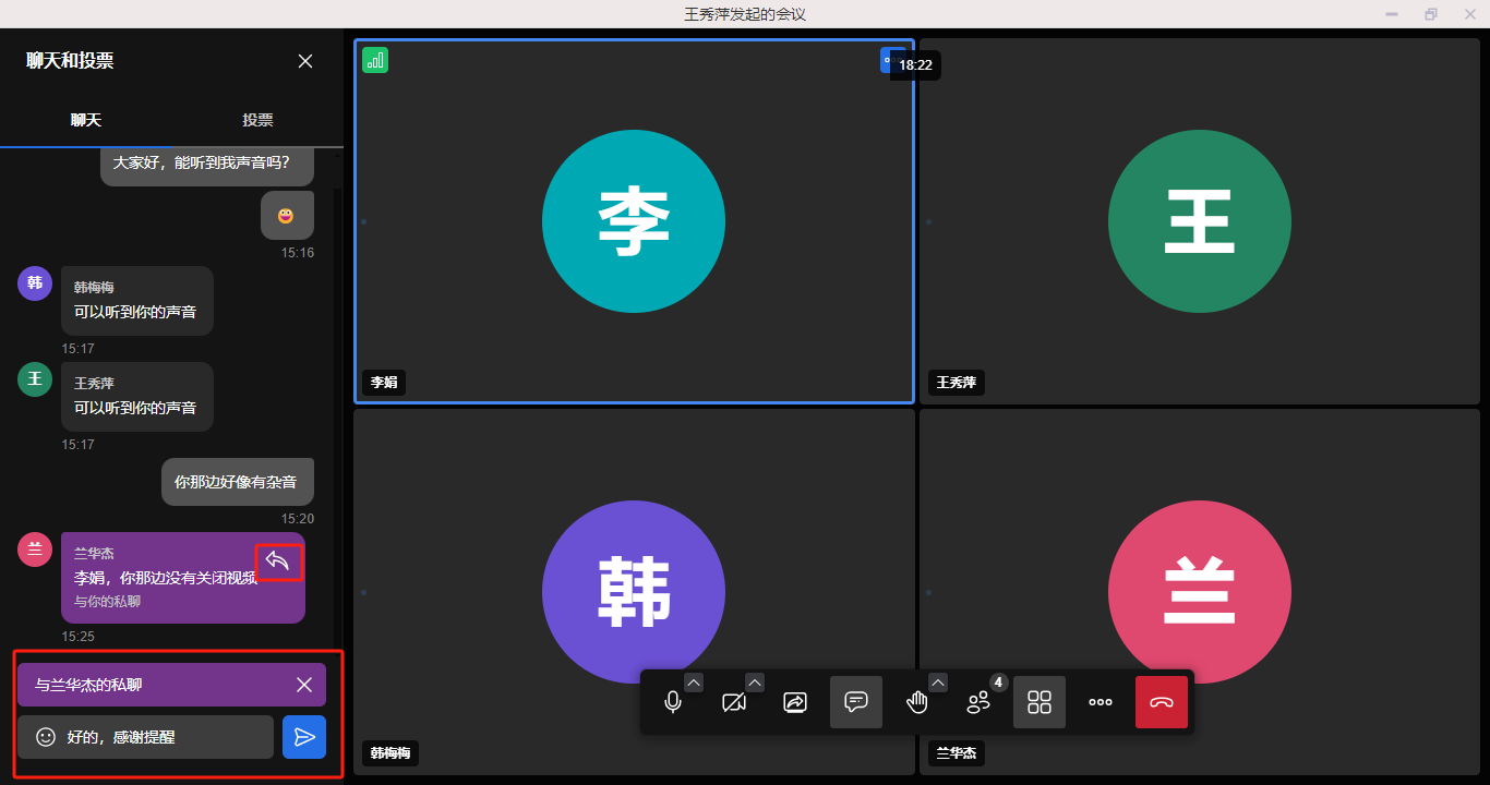 2. 私聊的消息只有发送人和接收人双方可以看到,会议内其他成员看不到这类消息。