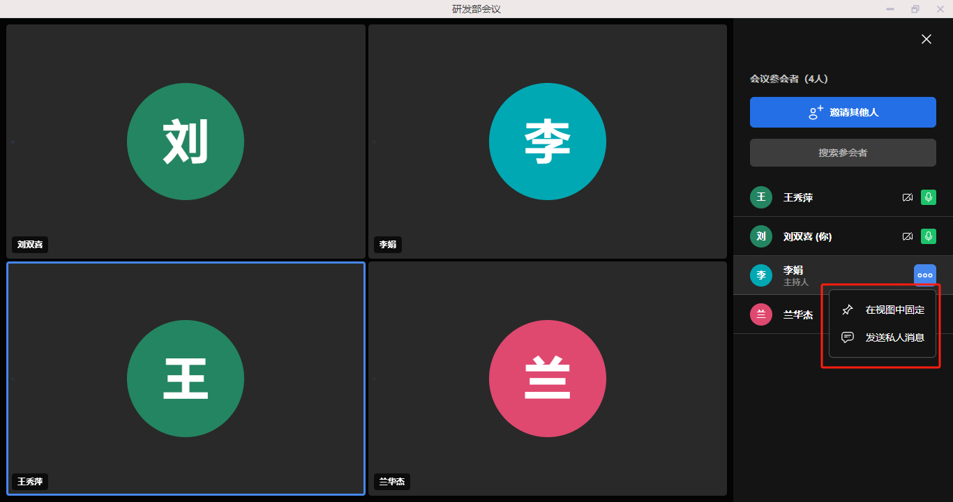 - 普通成员对参会成员的操作包括固定在主视图、私聊消息、调节声音等。