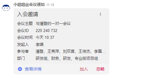 3. 受邀成员点击加入即可入会,点击忽略还可通过卡片的更多按钮或者在音视频会议应用处入会。