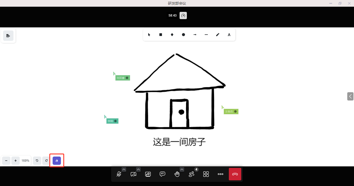 选中白板左下角的橡皮擦工具,使用鼠标点击并拖动橡皮擦工具,擦除白板上的不需要内容。橡皮擦所经过的路径上的所有内容都会被删除。