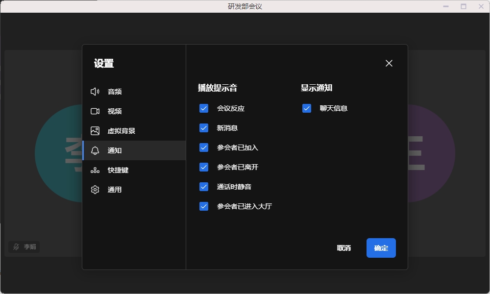 - 根据需要开启或关闭不同类型的播放提示音和显示通知,播放提示音选项包括:会议反应、新消息、参会者已加入/已离开提醒、通话时静音、参会者已进入大厅。显示通知支持控制聊天信息是否给当前参会者通知。
