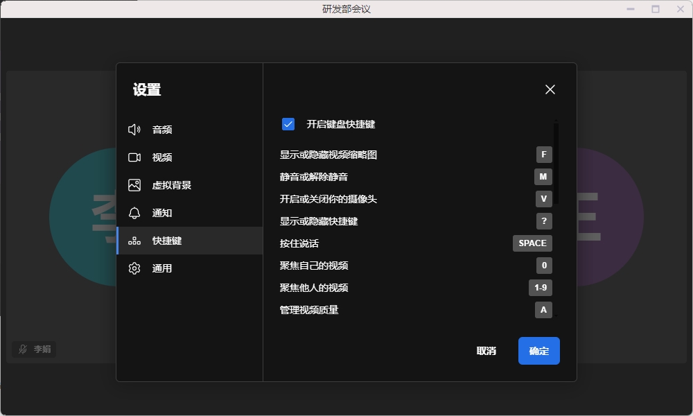 快捷键功能提供了一系列键盘快捷方式,帮助用户快速执行各种操作,提升会议操作效率。- 在设置菜单中勾选开启键盘快捷键即可通过快捷键控制会议。