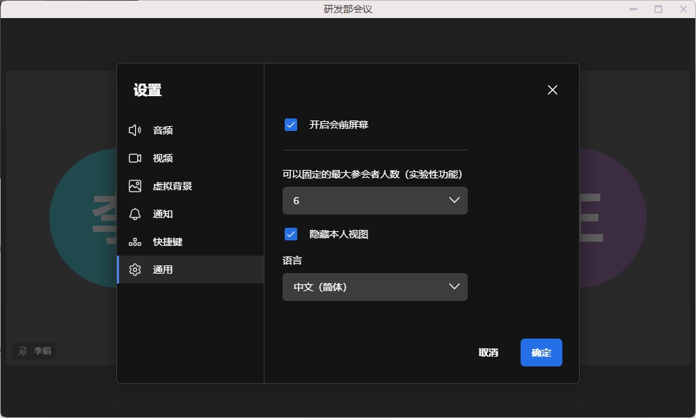 1. 开启会前屏幕设置:会前屏幕设置允许用户在会议开始前预览和调整自己的音视频设备,确保在进入会议时一切准备就绪。- 在更多设置-通用中启用“开启会前屏幕设置”,保存设置后,进入会议前将显示预览界面,用户可以在此调整摄像头、麦克风等设备。