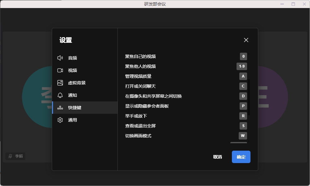 - 在快捷键设置页面,可以看到所有可用的快捷键及其对应功能。 记住常用的快捷键组合,在会议过程中使用这些快捷键可以快速执行相应操作,具体快捷如下图所示: