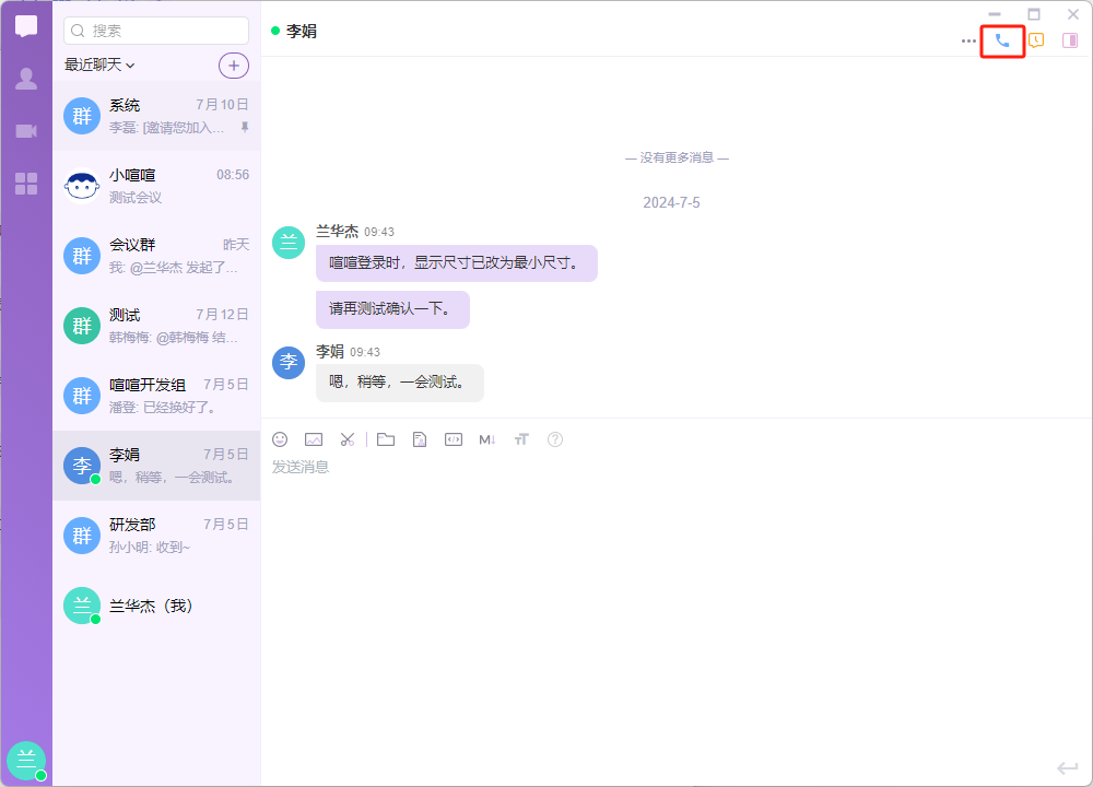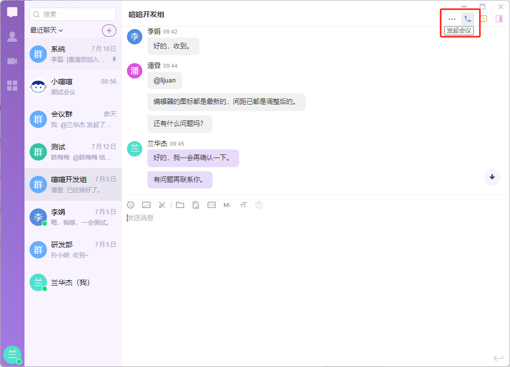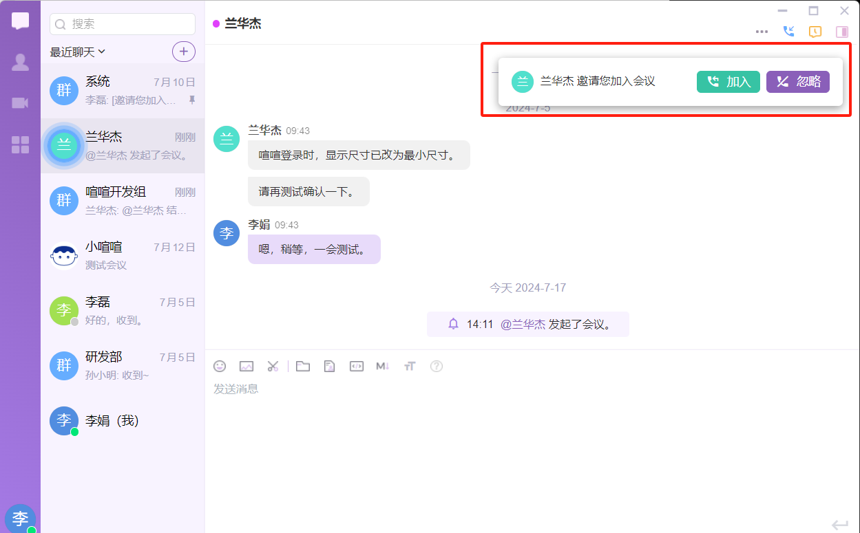 - 若从私聊中发起会议,在会话顶部显示会议通知。