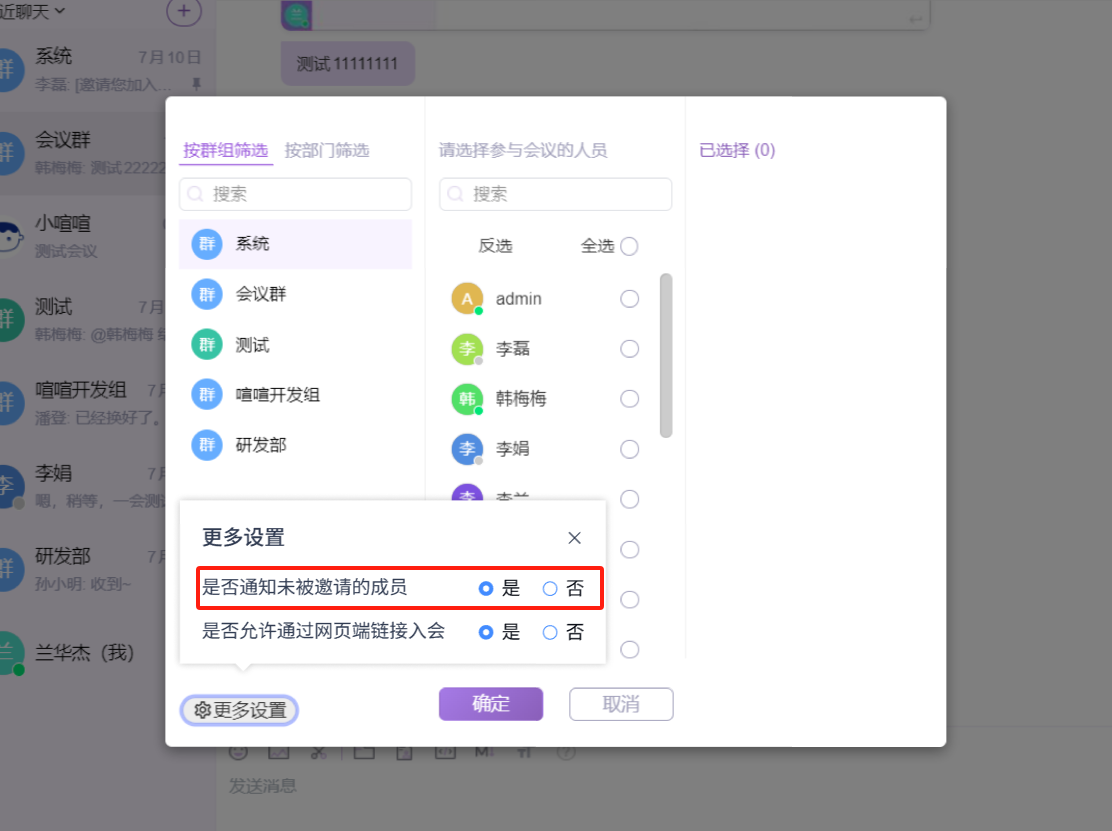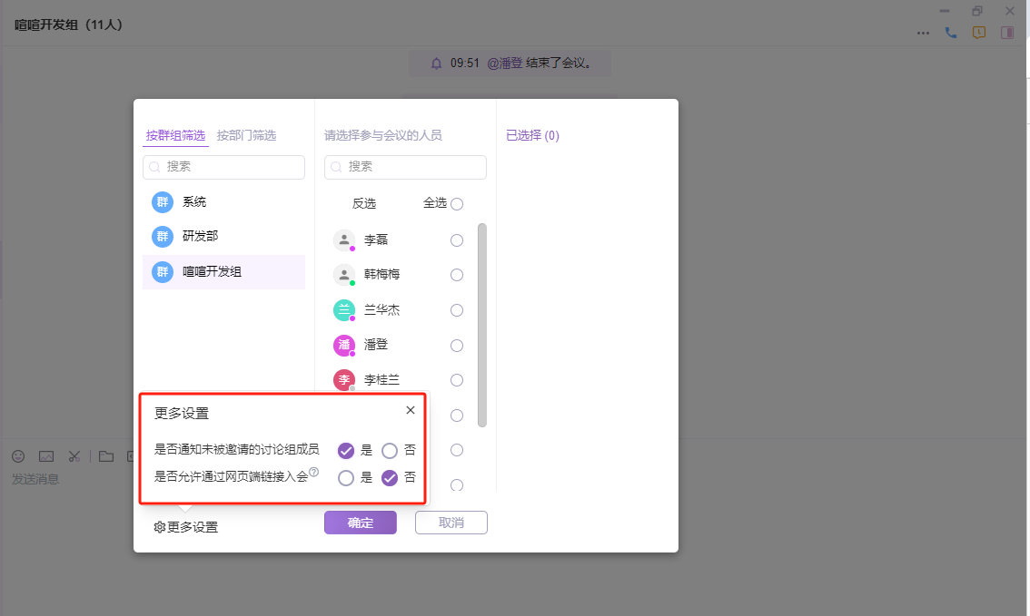 我们新增了群组会议的配置项,由于群组会议会选择具体成员,因此没被邀请到的成员可以选择是否通知,默认通过广播的形式进行通知,若不开启通知,未被邀请的成员将不会收到广播。