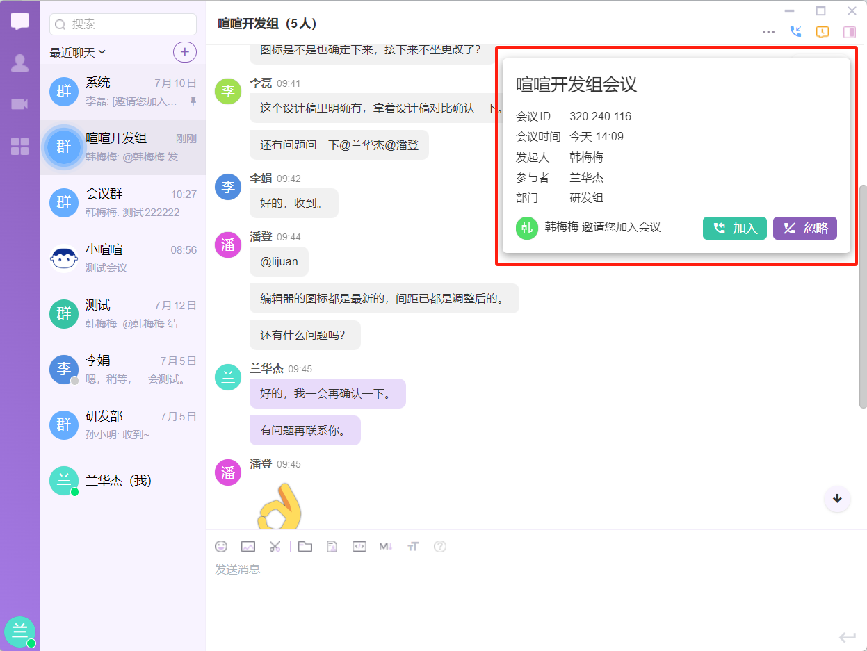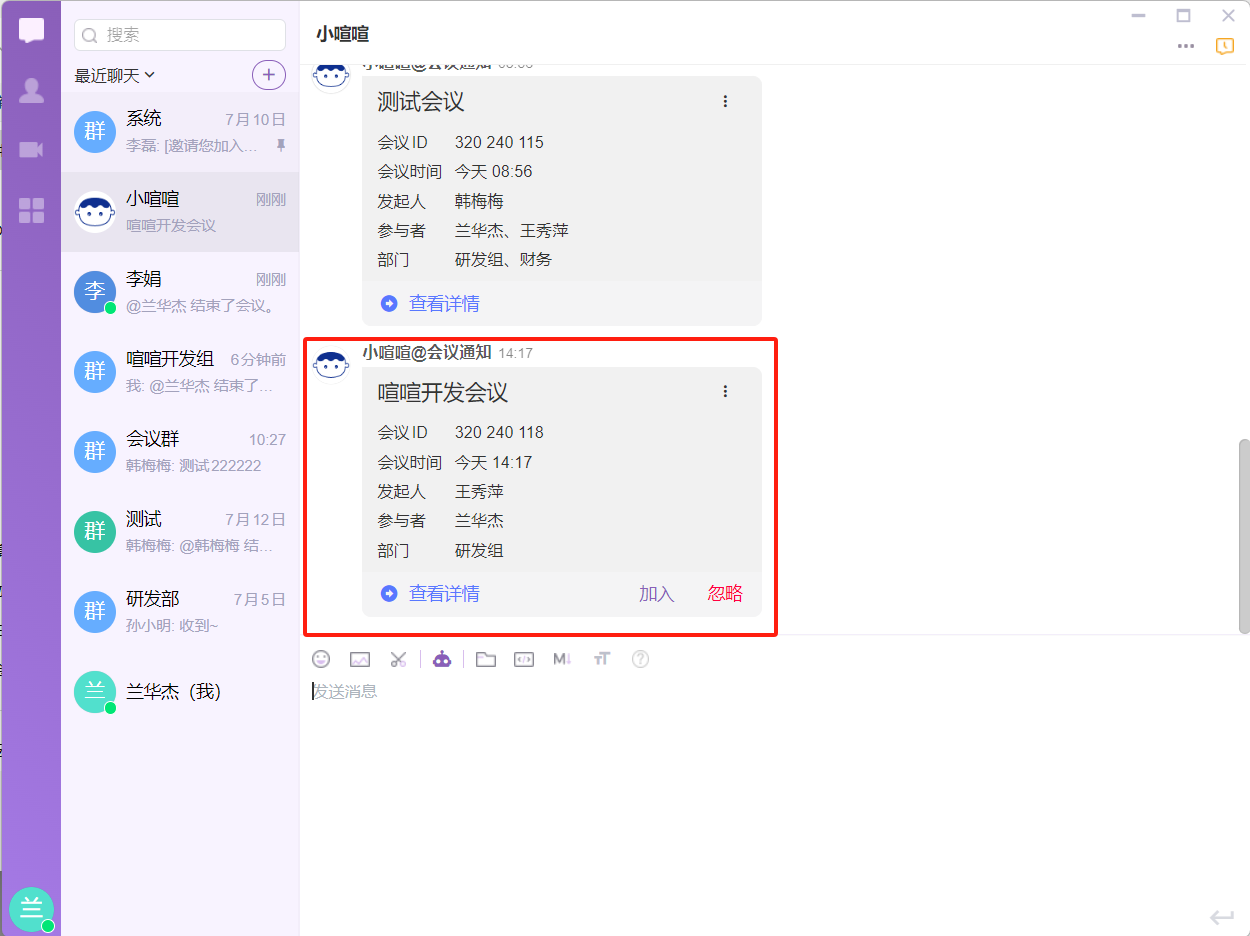 - 若从独立窗口发起会议,则通过小喧喧通知到个人。