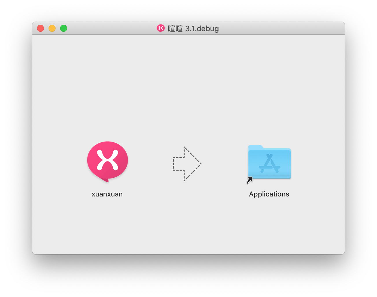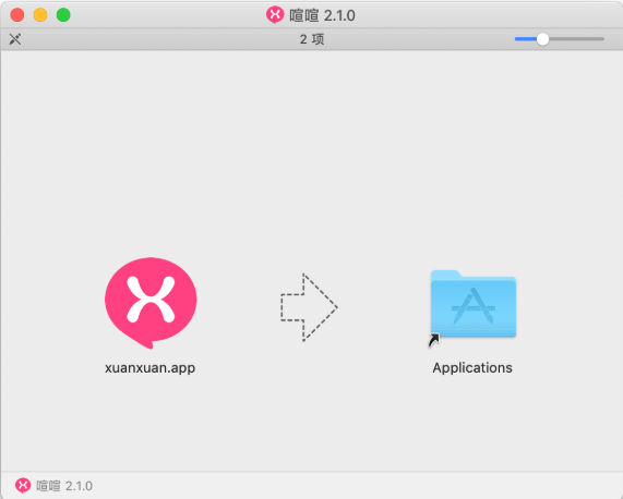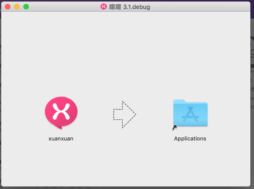 3.将镜像文件夹中的 xuanxuan.app 文件拖放到 Applications 文件夹即可,在应用文件夹点击 xuanxuan.app 即可运行。