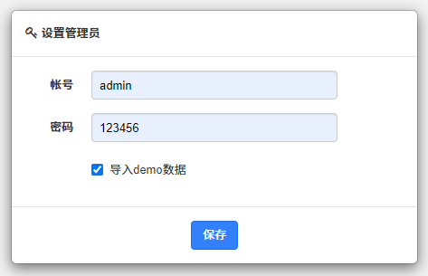 设置管理员帐号和密码,选择是否导入demo数据, 完成安装。