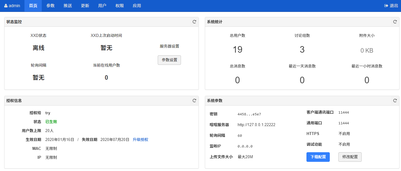 登录XXB的 后台,对喧喧XXD服务器参数进行设置,对移动推送进行设置,检查喧喧客户端版本的更新,添加第三方应用,还可在用户中添加和维护用户信息。