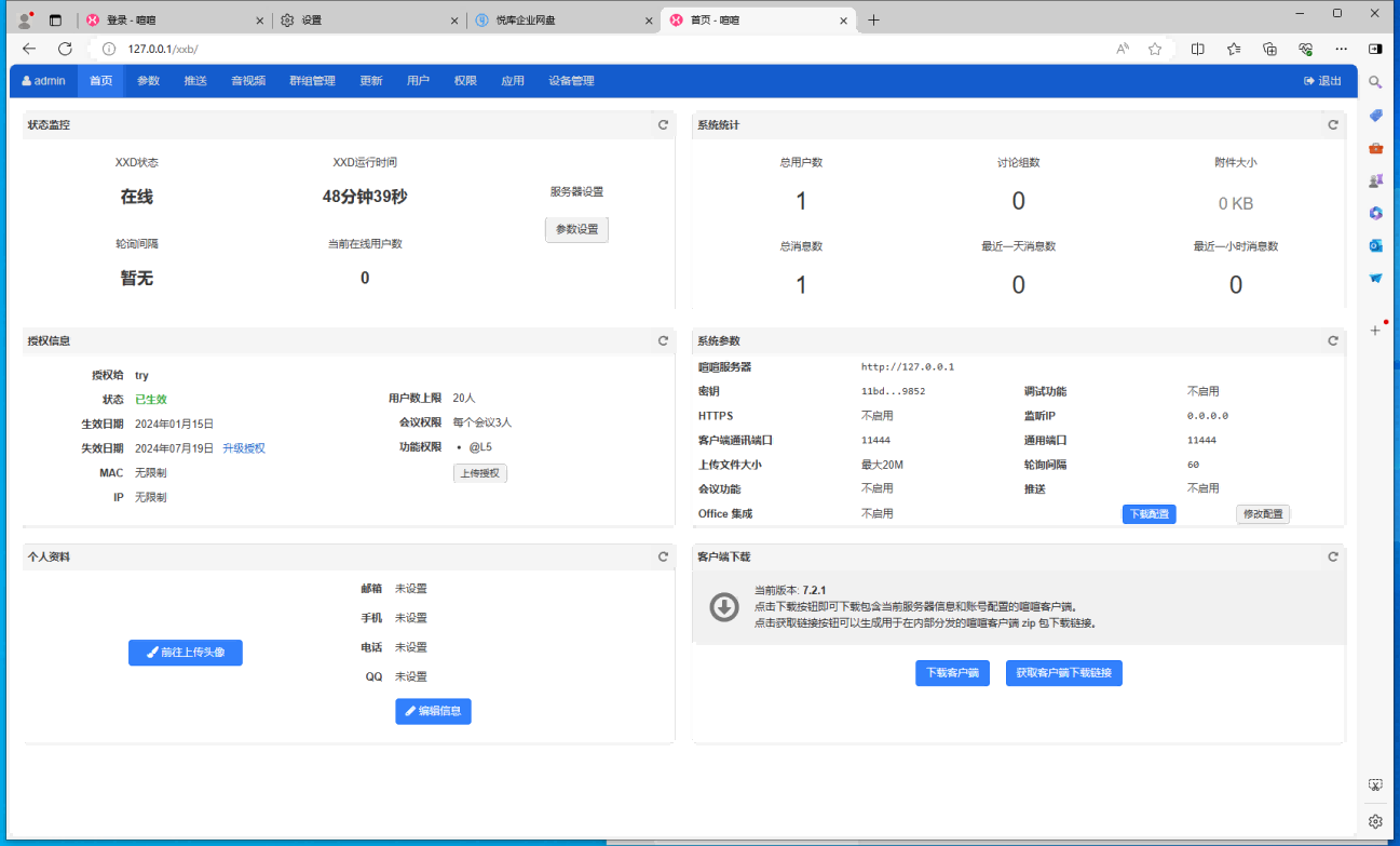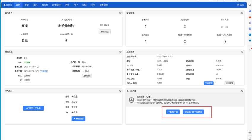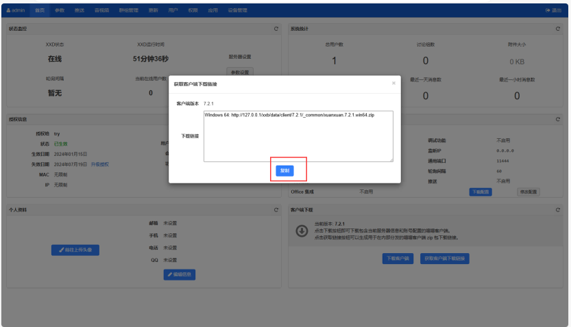 我们推荐使用喧喧服务端部署包来安装下载,用户登录喧喧后台,从客户端下载区块来下载客户端使用。管理员可以直接选择下载客户端进行下载,其他同事可以按需生成下载链接,按照下载链接地址直接下载即可。
