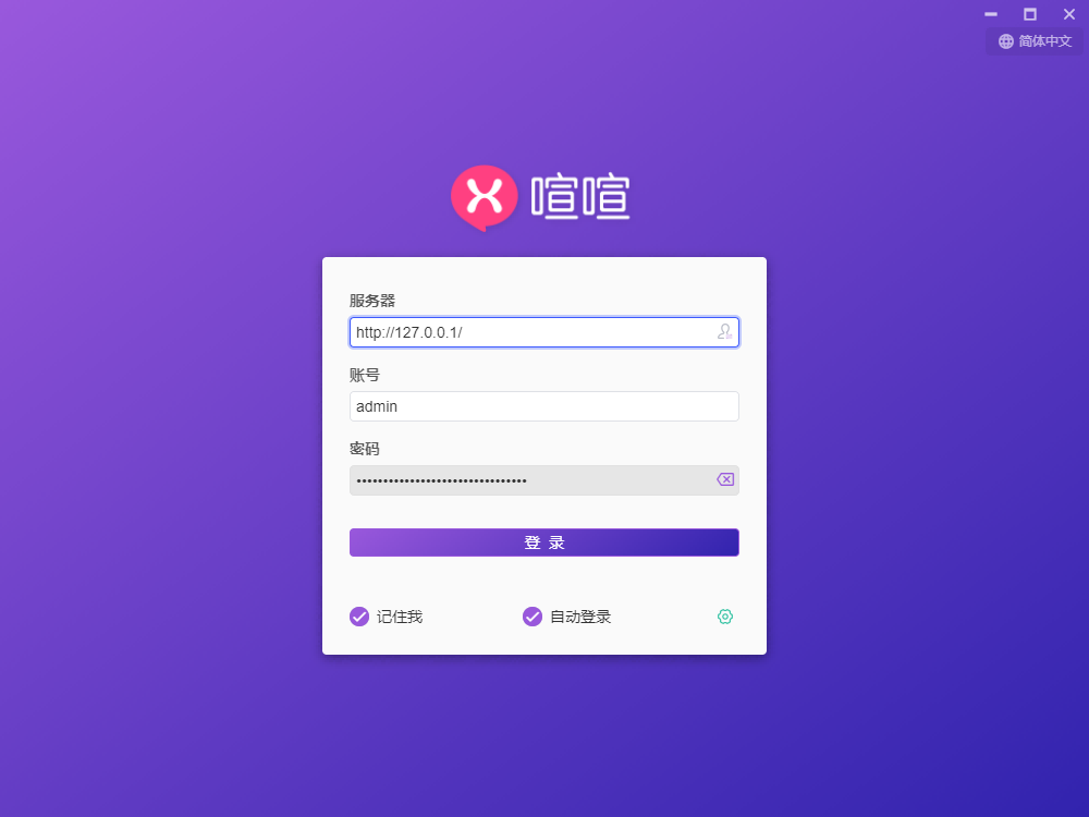 下载喧喧客户端后,安装并进入客户端登录窗口,填写服务器地址和用户帐号密码。