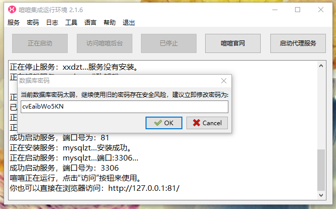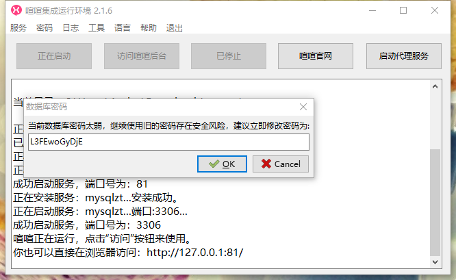 喧喧后端服务启动成功后,会提示数据库密码太弱,建议修改密码,您可按需修改数据库密码。