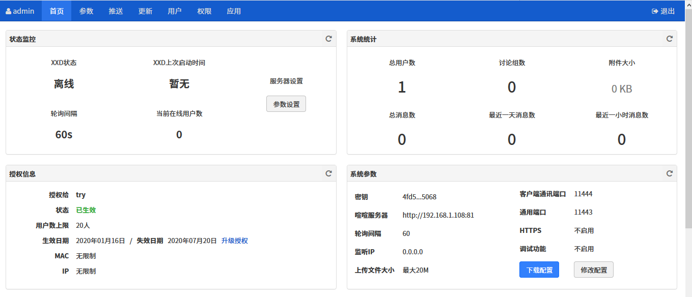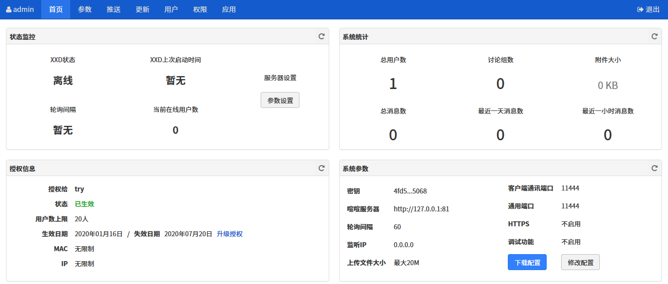 以下是登录成功后的喧喧后端处理服务器的后台首页