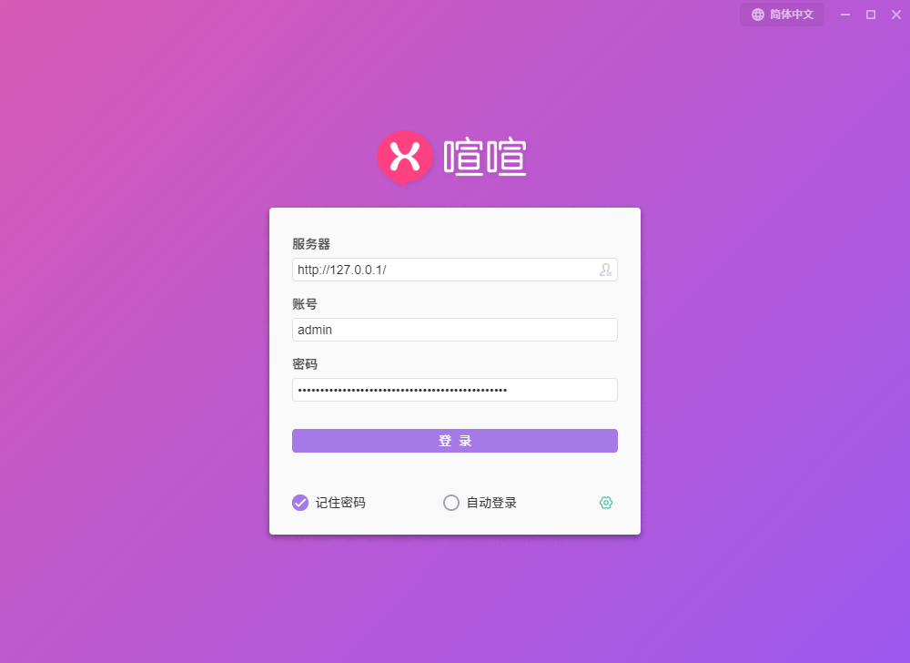 下载喧喧客户端后,安装并进入客户端登录窗口,填写服务器地址和用户帐号密码。