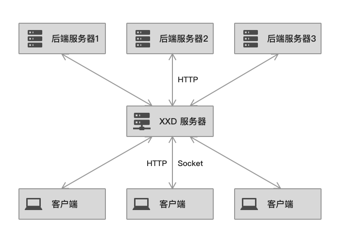 客户端(XXC)通过 Socket 连接到 XXD 服务器;XXD 服务器负责管理所有已连接的客户端,并且随时将客户端相关信息通过 HTTP 协议汇报给后端处理服务器(XXB)。