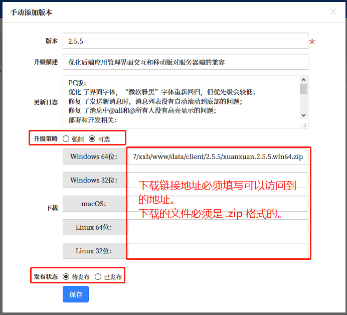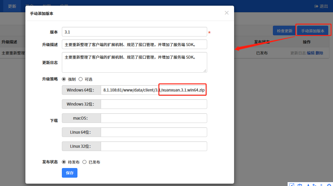 2.2 保存更新:该版本的状态是待发布,这时系统不会检测用户登录的喧喧客户端的版本。