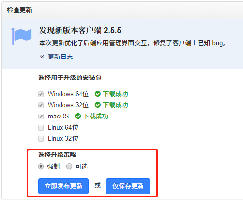 下载成功后,需要选择升级策略和发布与待发布状态。