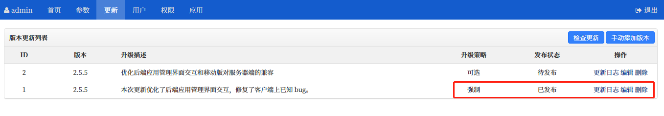 2.1 立即发布更新:该版本的状态是已发布,系统就开始检测 用户登录的喧喧客户端的版本。