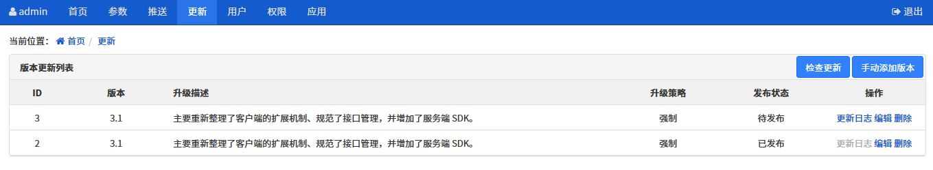 保存成功的版本,可以在版本的列表里查看到,可以通过 更新日志 编辑 删除 按钮来对版本进行修改。