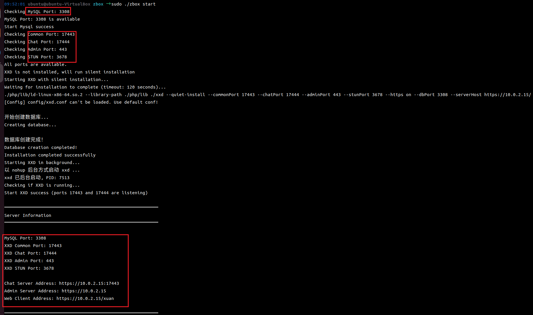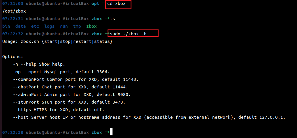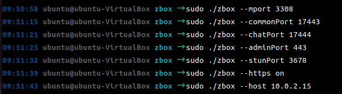 sudo ./zbox --mport 3308 sudo ./zbox --commonPort 17443 sudo ./zbox --chatPort 17444 sudo ./zbox --adminPort 80 sudo ./zbox --stunPort 3678 sudo ./zbox --https on sudo ./zbox --host 10.0.2.15