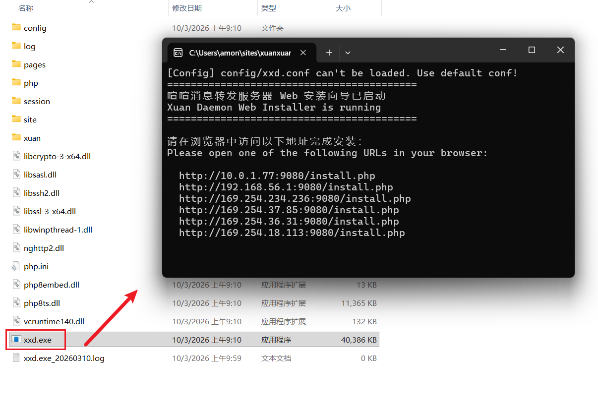 本文档以Windows一键安装包为例,下载后,将压缩包解压到服务器磁盘某目录下,如D:\xxd.10.2.win.x64。