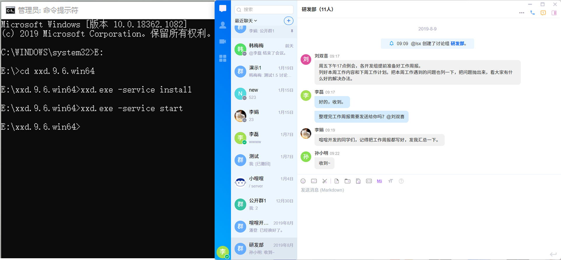 然后,通过命令 cd xxd.9.6.win64 ,切换到XXD服务所在的目录,接下来就可以安装XXD服务了。