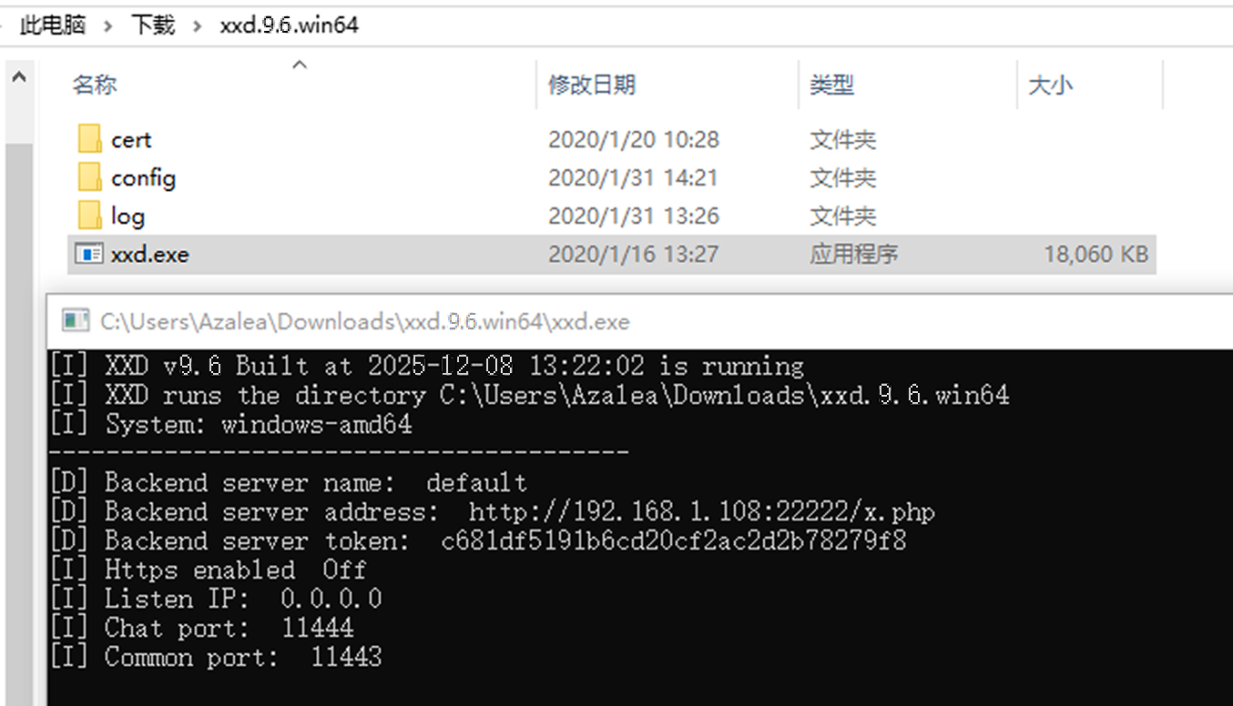 [server] ip=0.0.0.0 # 监听的IP地址,不要使用127.0.0.1。 commonPort=11443 # 登录和附件上传接口(http),确保防火墙开放此端口。 chatPort=11444 # 聊天消息通讯端口(websocket),确保防火墙开放此端口。 https=off # HTTPS(on|off)。使用HTTPS可以保证消息全程加密。 uploadPath=files/ # 附件保存的目录。默认存放在xxd/files/。 uploadFileSize=20M # 上传文件的大小,以M为单位。 pollingInterval=60 # 轮询时间,单位为秒,最小值为 5。 maxOnlineUser=0 # 在线用户上限,0为无限制。 logPath=log/ # 程序运行日志的保存路径。 certPath=cert/ # 证书的保存路径。 debug=0 # Debug级别,可设置0|1|2 [backend] # xxd可以对接多个后台程序。每一个后台程序由入口文件 + 私钥组成。 # 客户端登录时如果没有指定后台程序,会默认登录到第一个后台程序。 default=http://192.168.1.108:22222/x.php,c681df5191b6cd20cf2ac2d2b78279f8