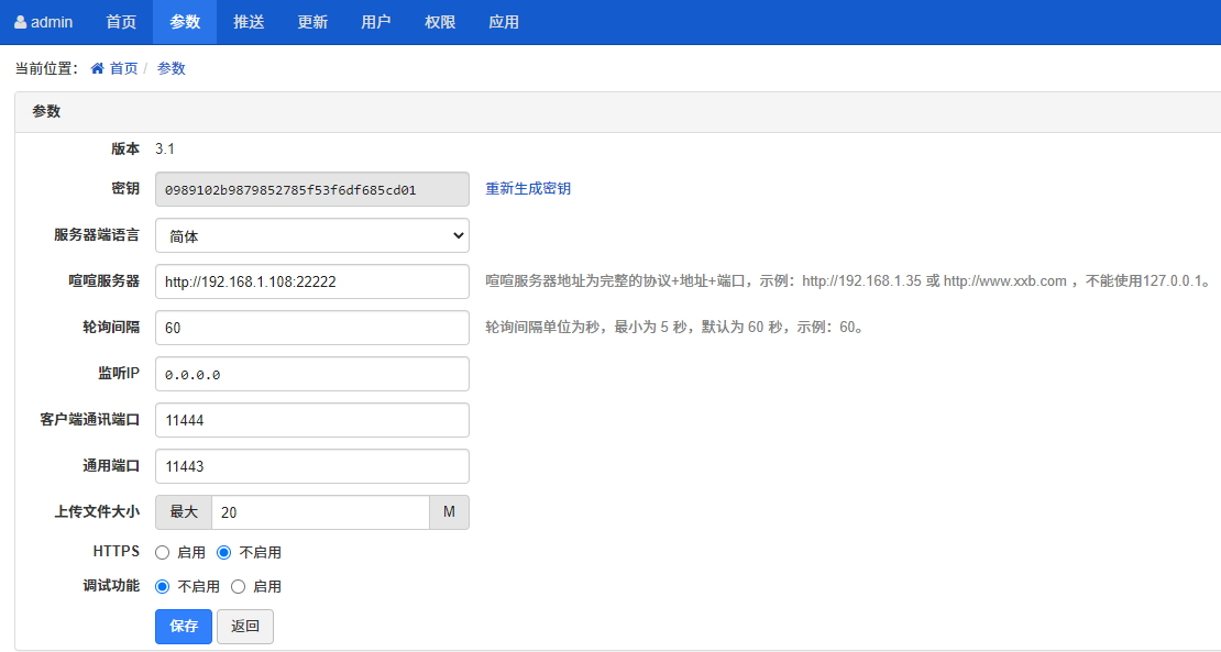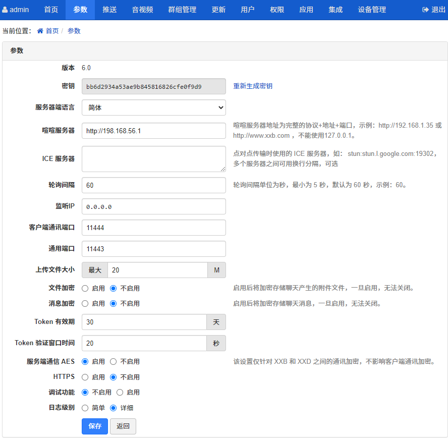 参数设置里,主要是配置和维护喧喧消息中转服务器和喧喧客户端的系统信息。