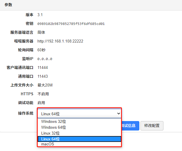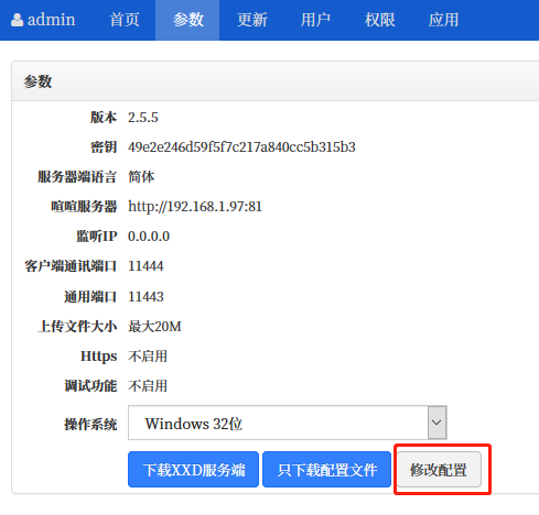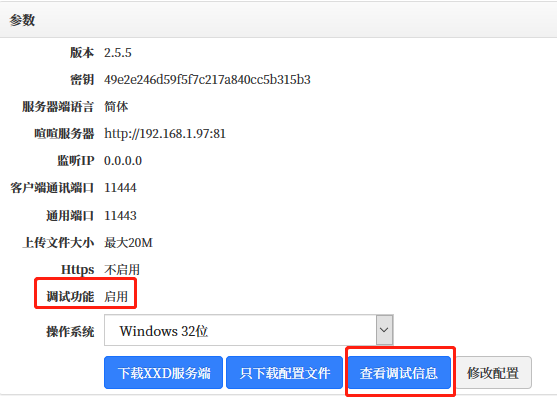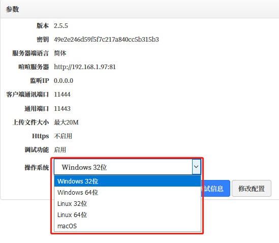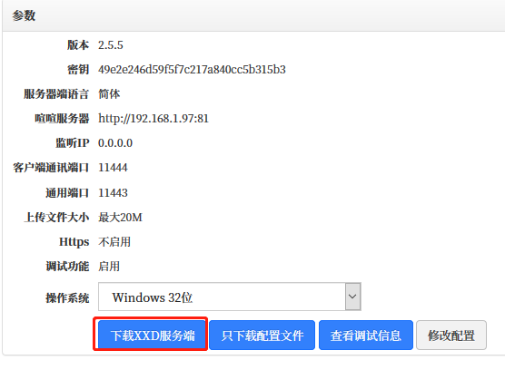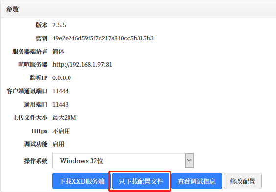 可以修改配置信息,可以选择需要的操作系统,下载喧喧XXD服务器端,也可以仅下载配置文件。
