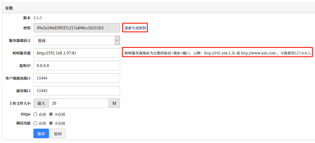 2、密钥:系统会默认生成,也可以点击 重新生成密钥 来生成新密钥。XXB 和 XXD 的密钥必须一致。