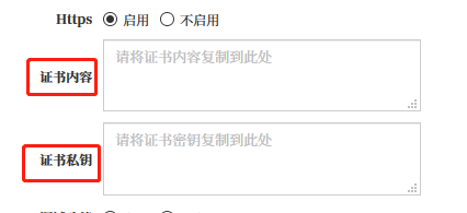 11、Https:是否启用https访问协议,如果启用的话,需要把证书内容和密钥复制粘贴到填写框里。