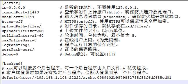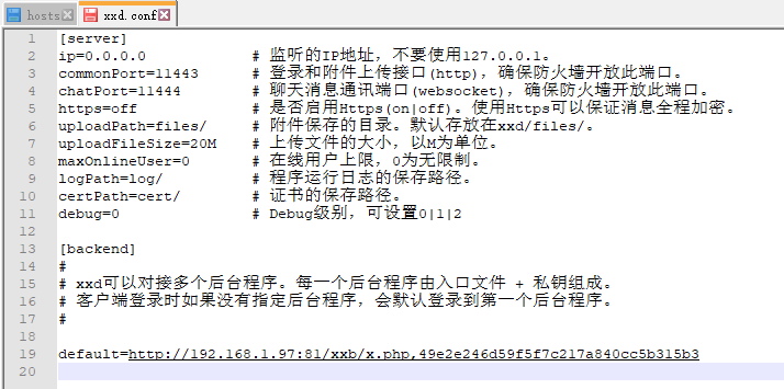 记录喧喧消息中转服务器(XXD)的配置信息。