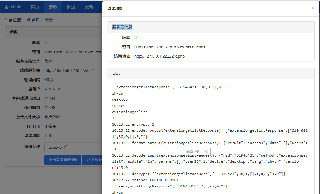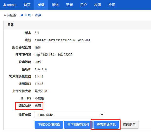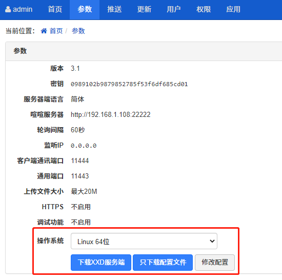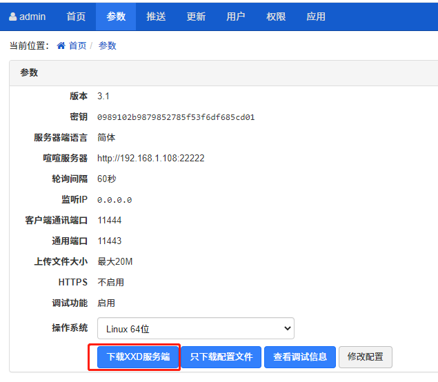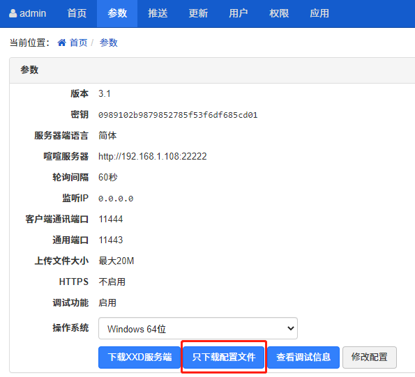 参数信息都配置完,保存成功后,就可以下载XXD 服务器端或者是只下载 XXD 的配置文件。